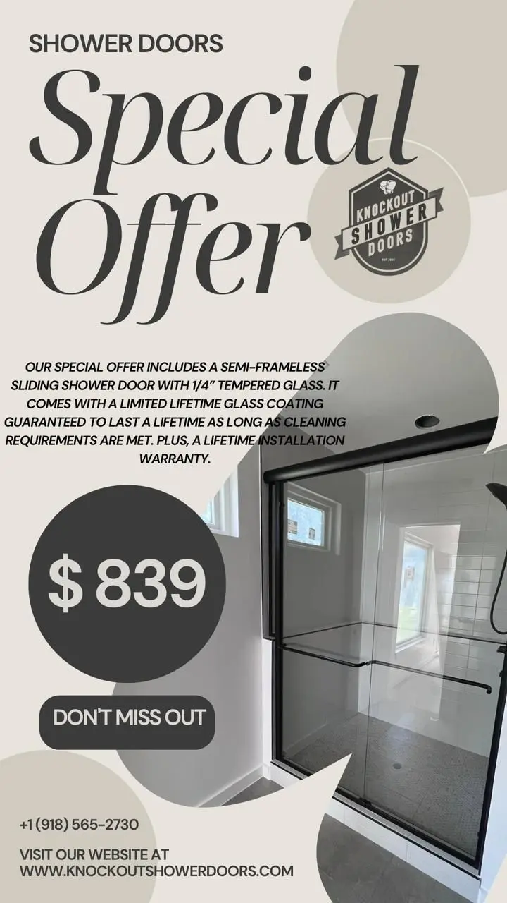 Knockout Shower + Doors is a Tulsa company with over 11 years of experience. We provide high-quality shower door glass and shower installation with exceptional customer service. We offer a wide range of options, competitive pricing, and a Lifetime Installation and Product warranty. This ensures you get the most value and peace of mind. (25)Â 5-star Google reviews highlight the commitment to exceeding expectations. Contact Knockout Shower + Doors for a free quote.